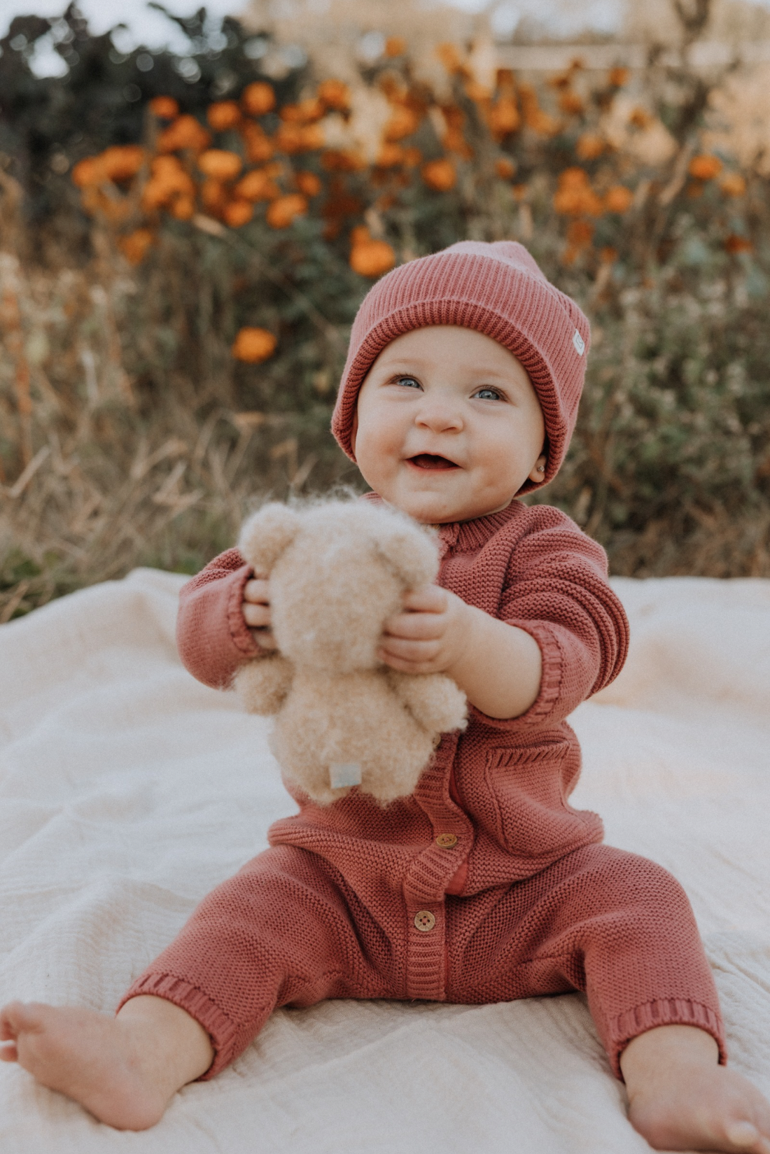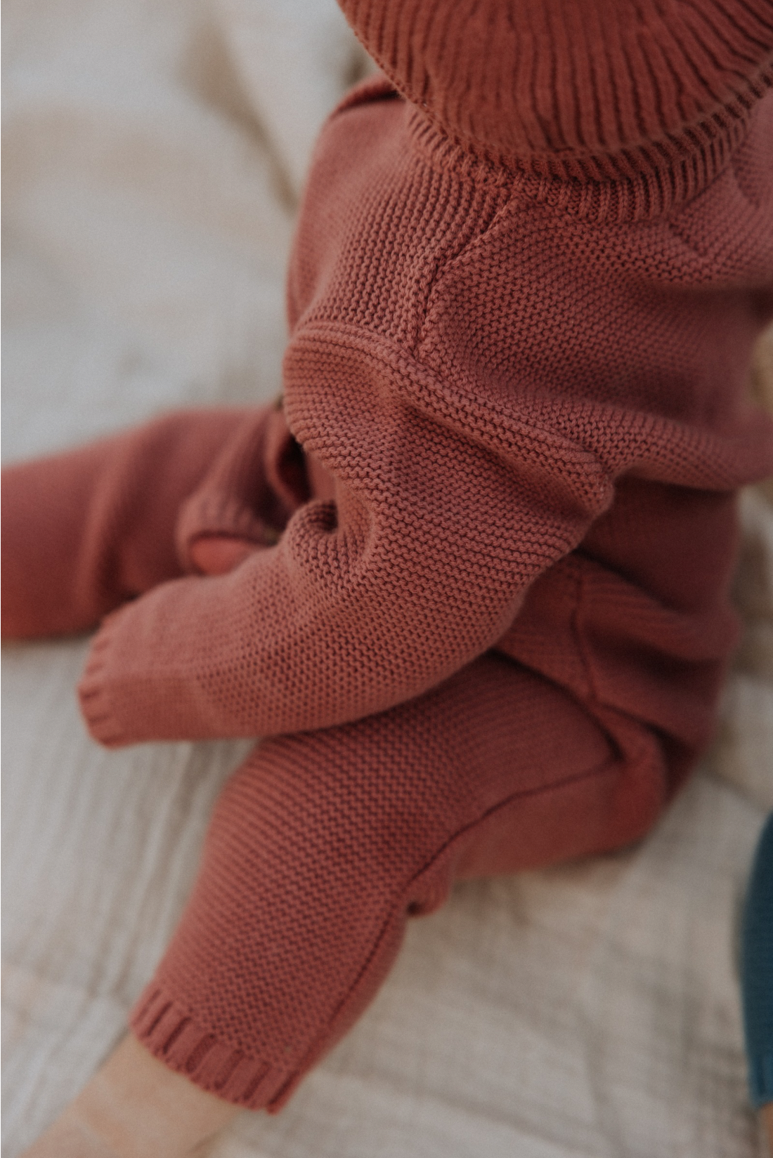The textured garter stitch adds a rich, hand-knit feel, while the charming front pocket brings just the right touch of whimsy. Hidden magnetic fasteners make dressing effortless, transforming everyday changes into simple, fuss-free moments.