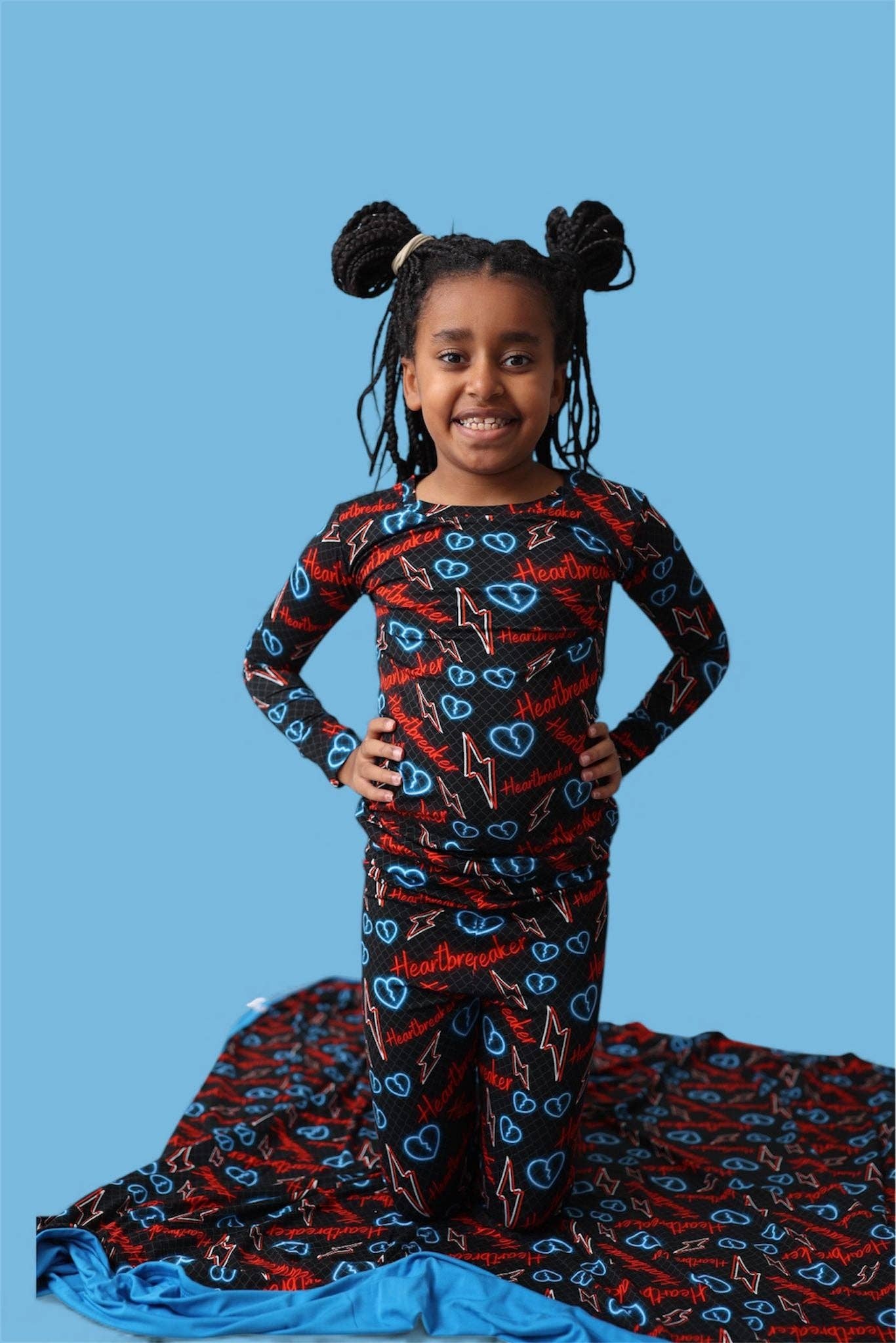 ⚡💙❤️ Heartbreaker Dream Set ❤️💙⚡ Cozy meets cool! The Heartbreaker Dream Set features a long sleeve top and matching pants with a striking neon-style print of glowing hearts, lightning bolts, and “Heartbreaker” script. Crafted from our signature buttery-soft bamboo fabric, this set is breathable, stretchy, and perfect for sleep, play, or lounging in style. * ⚡ Neon-style hearts, lightning bolts & “Heartbreaker” print * ❤️ Two-piece set: long sleeve top + matching pants * 💕 Buttery-soft, breathable bamboo fabric * 🌙 Gentle on sensitive skin with tagless comfort * 👯 Matching sibling styles available A bold, rockstar-inspired set your little one will love for playtime, snuggles, and sweet dreams! 95% Bamboo form Viscose; 5% Spandex Snug fit to meet CPSC Compliance.