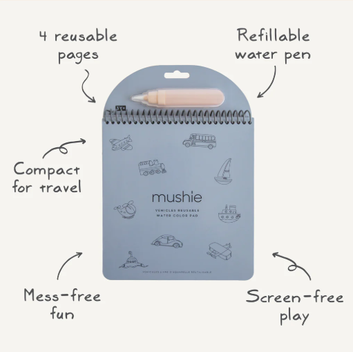 Little imaginations will soar far and wide with the Mushie reusable water color pad. Featuring four pages of colorful planes, trains and automobiles that come to life with just water. A refillable paintbrush allows children to easily “paint” the pages, revealing vibrant scenes and hidden surprises. Once dry, the pages turn back to white, ready to be used again and again. Crafted from FSC Certified paper, this is a sustainable and mess-free way to inspire creativity. Makes a perfect travel companion for little artists on the go.