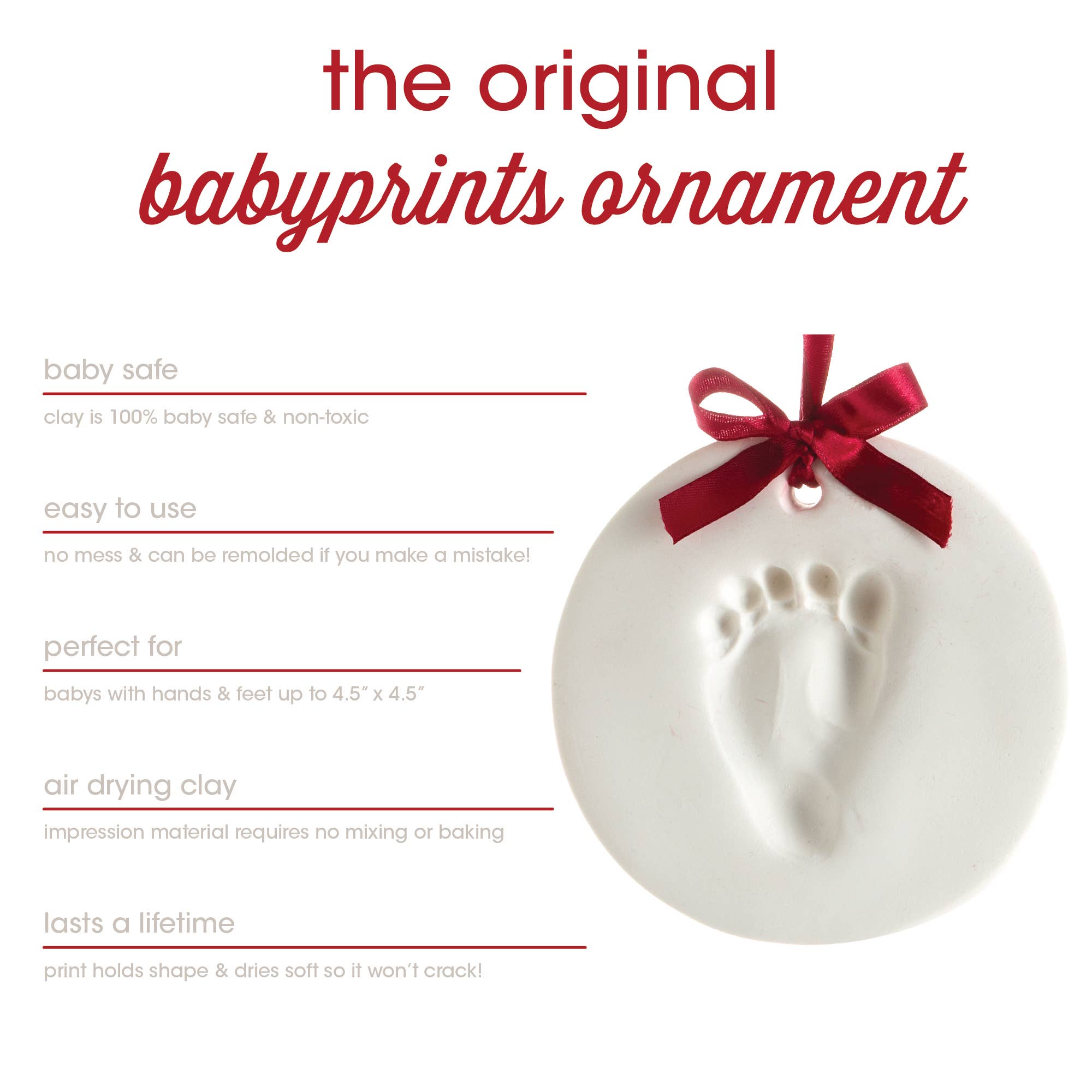 • All-In-One Holiday Kit: Includes everything you need to create a personalized baby Christmas ornament—100% baby-safe impression material, a shaping ring, a festive red satin ribbon for hanging, and a pin to create the ribbon hole.