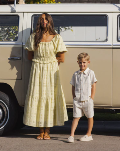 A classic collared boys short sleeve button-down shirt with coconut buttons.