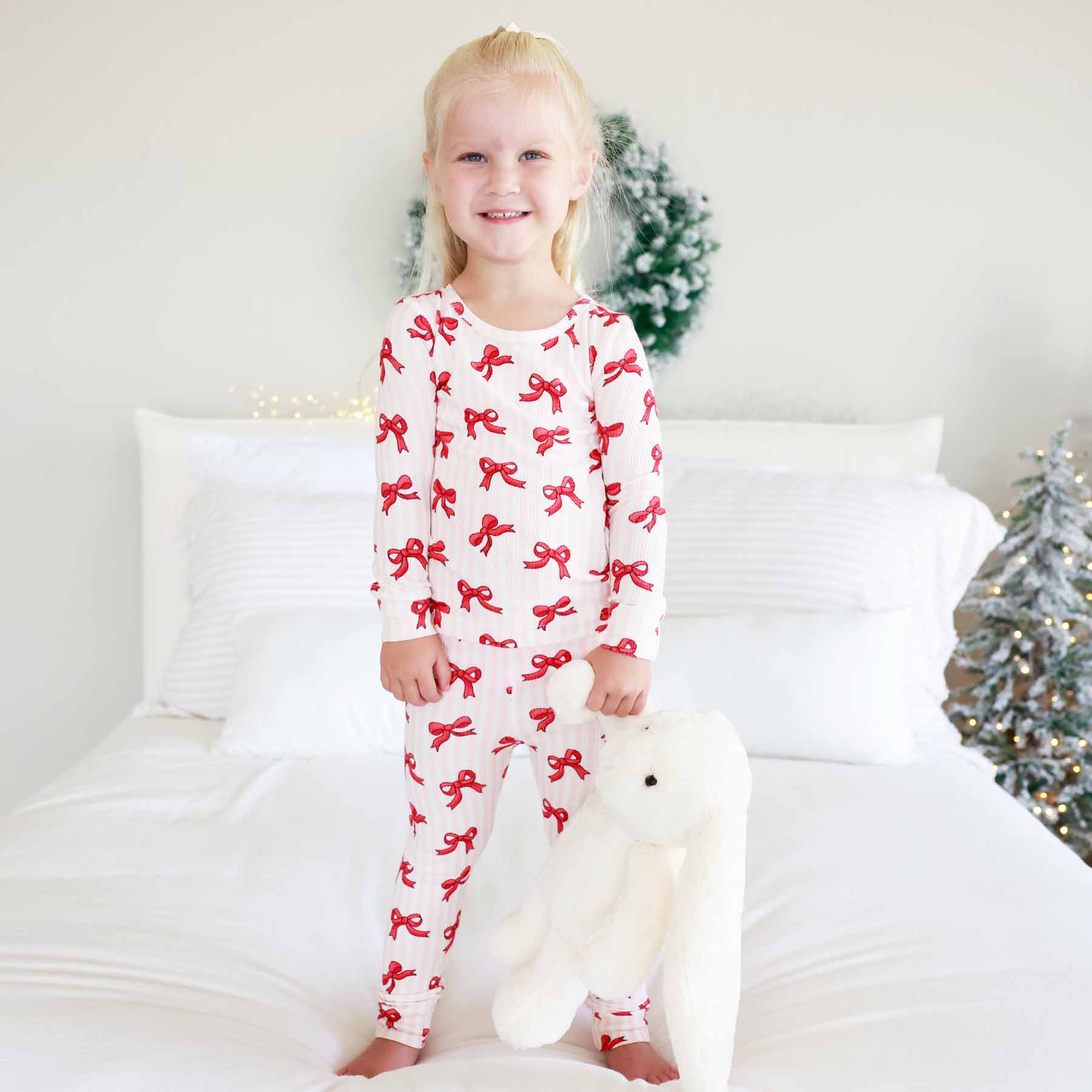 Two Piece Pajama Set Details: * 95% Bamboo Viscose | 5% Spandex * Breathable bamboo ideal for sensitive skin * True-to-size * Set Includes: 1 Long Sleeve Top & Pant * For child's safety, this garment should fit snugly. This garment is not flame resistant. Care Instructions: * Machine Wash Cold - Gentle Cycle * Phosphate Free Detergent Recommended for Color Care * Wash with like fabrics (bamboo only) * Layette should be washed inside out * Line Dry / Air Fluff * Do NOT use Fabric Softener Made for merry mornings and cozy nights, our Coquette Christmas Two-Piece Pajama Set is a holiday must-have for little ones. With bright red bows dancing across soft pink and white stripes, these PJs bring just the right amount of festive fun to bedtime and beyond.