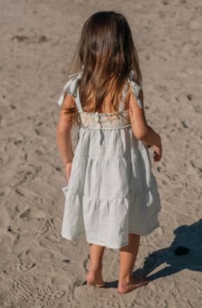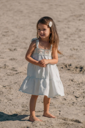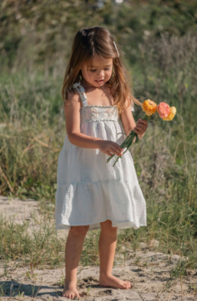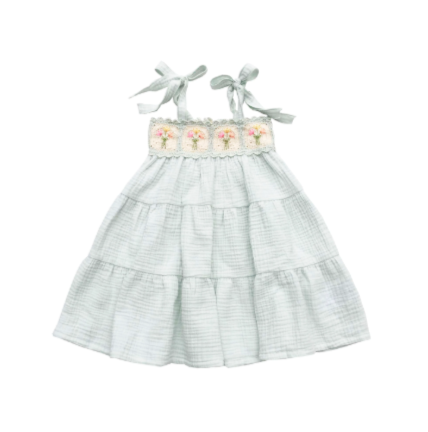 Adjustable shoulder tie straps grow with your child, while the soft, three-tiered skirt flows with every movement. Crafted in dreamy pastel seafoam with breathable 100% cotton gauze—perfect for spring celebrations, special moments, and everyday magic alike.